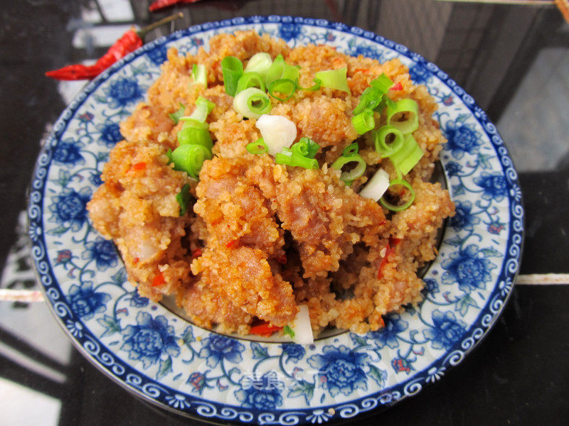 With bighead carp (fat head fish) fish head, covered with chopped pepper and steamed over a large fire. The fish head is fresh and tender, the fresh and spicy of chopped pepper is completely infiltrated, the soup mixed with rice is a must, and the color is red and bright and attractive.